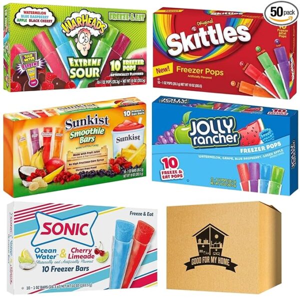Be summer ready with this freezer pops variety pack! This ice pops variety pack bundle includes a Good for My Home Box and 1 box of freezer pops from 5 brands: Skittles Popsicles, Jolly Rancher Freezer Pops, Warheads Extreme Sour Pops, Sonic Freezer Bars and Sunkist Smoothie Bars. Each box of Freezer Pops in this bundle includes 10 count of ice pops. You'll get 50 fruit flavored ice pops with this bundle. Enjoy more than 15 amazing flavors including Sonic Ocean Water, Cherry Limeade, Skittles Strawberry Popsicles, Jolly Ranchers Watermelon Popsicle, War Heads Extreme Sour Black Cherry Popsicle and more! This bundle is the perfect summer candy for kids. Ice popsicles are not just for kids to enjoy in the summer heat, you could grab one too and beat the heat. It’s the ultimate summertime treat that is incredibly easy to make frozen fruit bars! Just place each box from this Freezer Pops Variety Pack in the freezer, wait for the liquid to freeze, snip off the top, and your frozen treat is ready to have a blast.