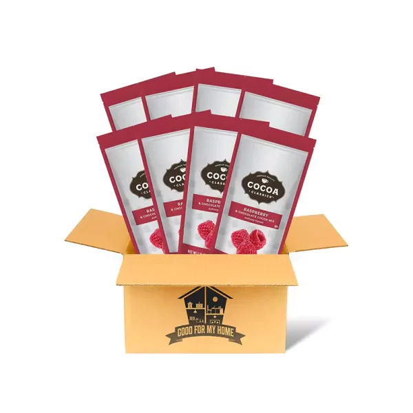 Hot Cocoa Mix Packets. Includes Eight 1.25 Oz each of Raspberry & Chocolate Cocoa Drink Flavored Packets. Ideal drink for Cold Weather and Paired with Soft Biscuits! Comes with a Good For My Home Box!