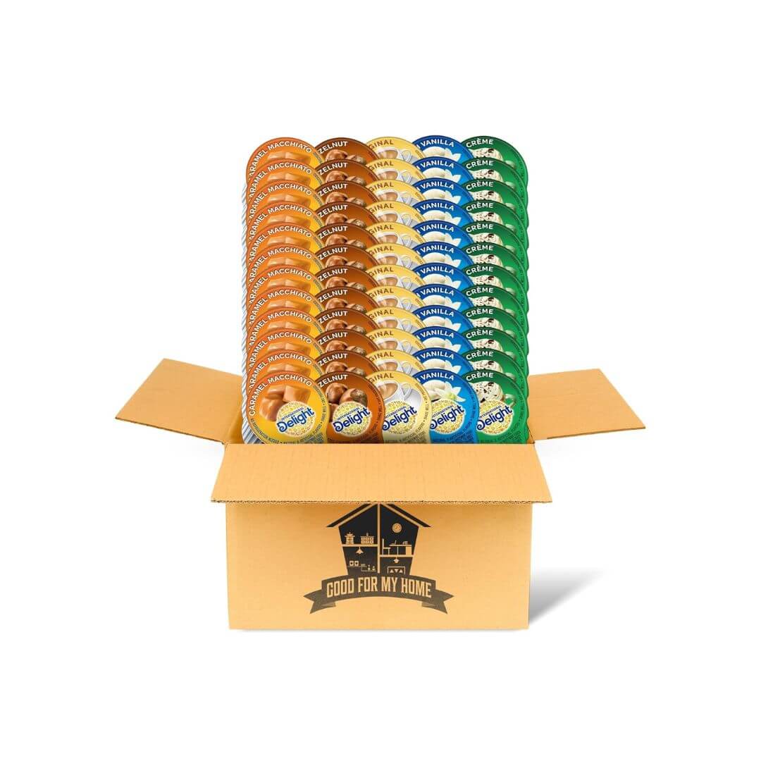 Assorted Coffee Creamers. Includes 60 ct of International Delayts’ Pods Liquid Coffee Creamer. 12 Each Irish Creme, French Vanilla, Original Creamer, Hazelnut, and Caramel Macchiato + GFMH Box!