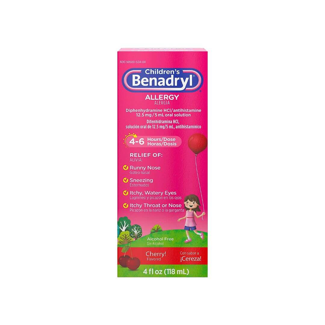 Benadryl Children’s Allergy Relief Liquid Medicine with Diphenhydramine HCl, Kids’ Allergy Syrup for Allergy Symptoms Like Runny Nose, Itchy Eyes & More, Cherry Flavor, 4 fl. oz