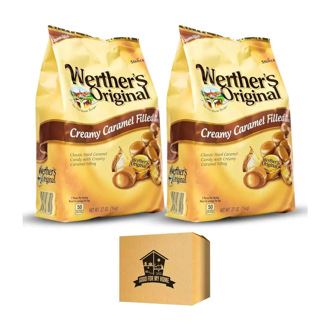 Caramel Filled Bulk Hard Candy Two-27 Oz Werthers Caramel Filled Candy Bags in a Good For My Home Box. Werthers Original Hard Candy with Creamy Caramel! Individually Wrapped Caramels for Sharing!