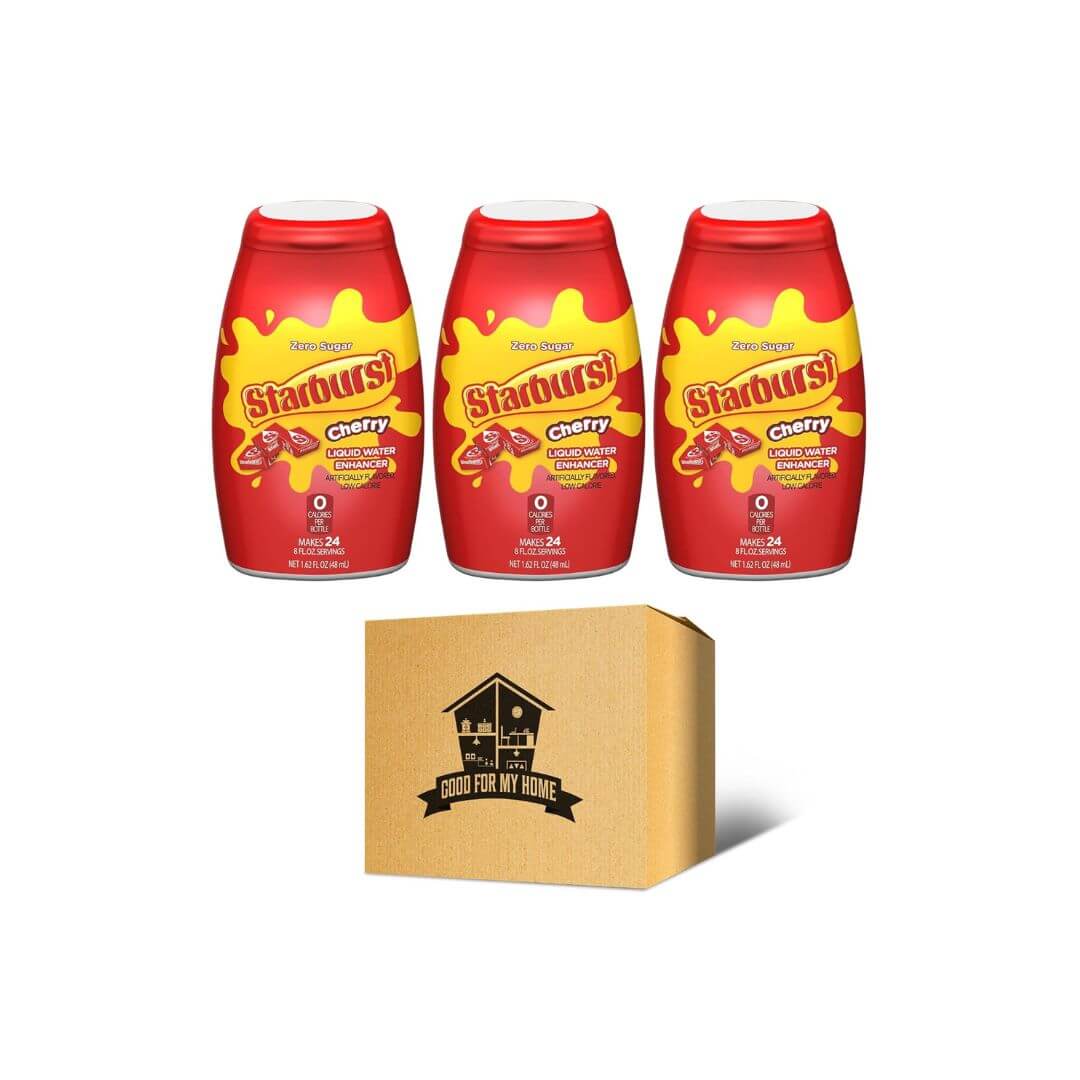 Cherry Water Enhancer Bundle. Includes Three Cherry Star-berst Liquid Water Enhancer in a Good For My Home Box. Starburst Cherry Water Flavoring Drops is a Sugar Free Water Enhancer!