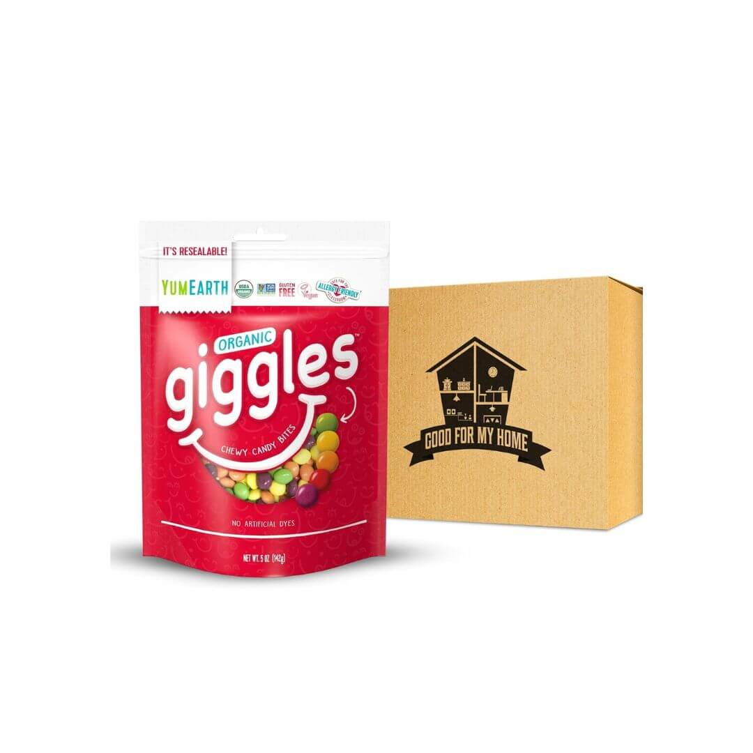 Healthy Candy For Kids Bundle. One-5 Oz Bag of Yum Earth Giggles Fruit Candy in a Good For My Home Box. Yumearth Giggles Organic Chewy Candy is a Dye Free Candy and Vegan Candy!