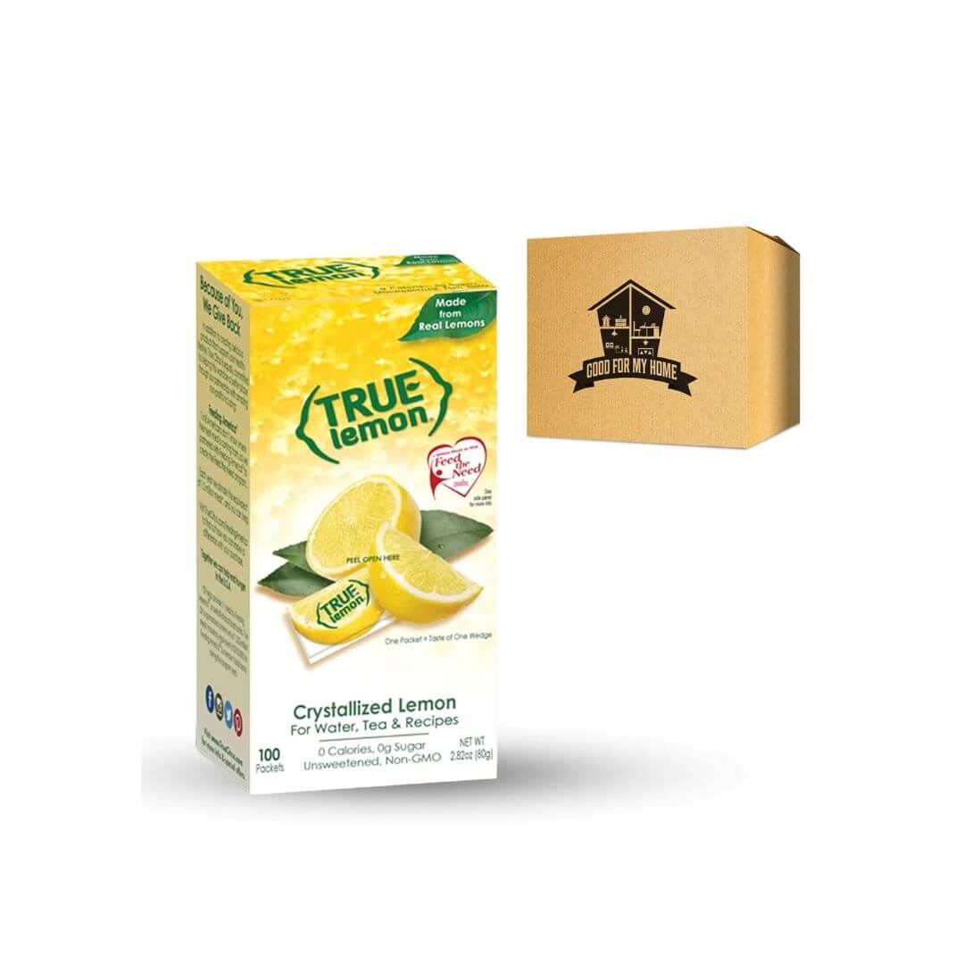 Lemon Packets Bundle. Includes One 2.82 Oz Box 100ct True Lemon Crystallized Lemon Water Enhancer Packets. Unsweetened Water Flavoring, Made with Real Lemon Citrus. Comes with a Good For My Home Box!