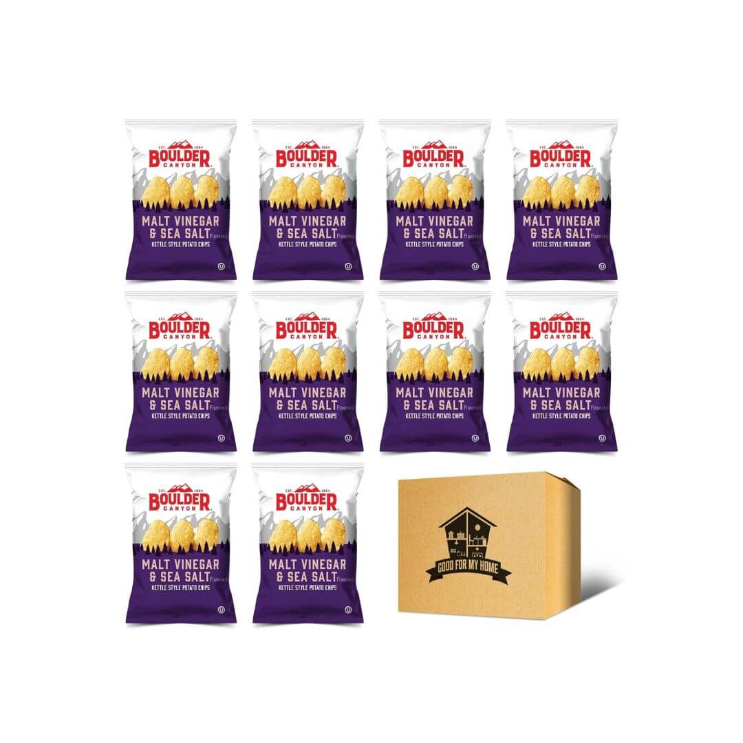 Malt Vinegar and Sea Salt Chips Bundle. Includes Ten 1.5 Oz Packs of Kettle-Cooked Chips. Tangy Salt & Vinegar Flavor by Boulder Canyon Potato Chips. Non-GMO, Gluten-Free, Kosher with a Good For My Home Box!