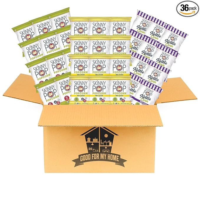 Popcorn Variety Pack. Includes Thirty-six 0.5 Oz per Pack of Skinny Popp Popcorn Snack Packs. 12 each White Cheddar, Sweet & Salty Kettle, and Original Gluten Free Popcorn Snack. Comes with a GFMH Box