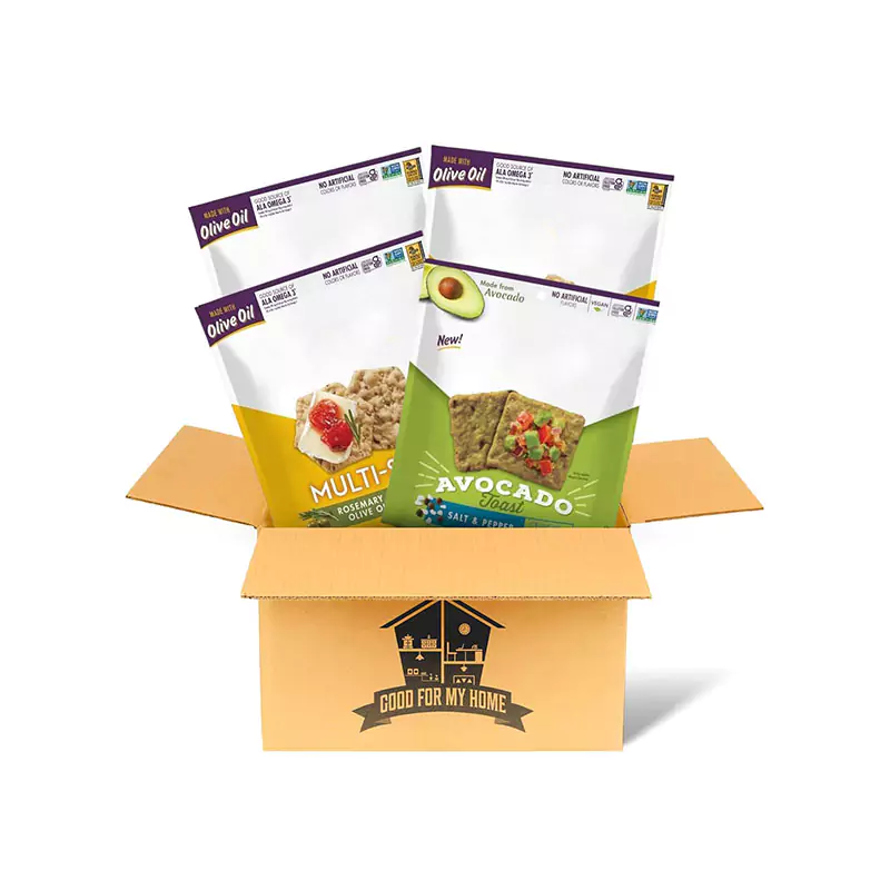 Rice Crackers Variety Pack. Includes Four-4 Oz Bags of Krunchmoster Crackers in a Good For My Home Box. One Each: Roasted Garlic, Original, Rosemary & Olive Oil, and Avacado Toast Salt & Pepper!