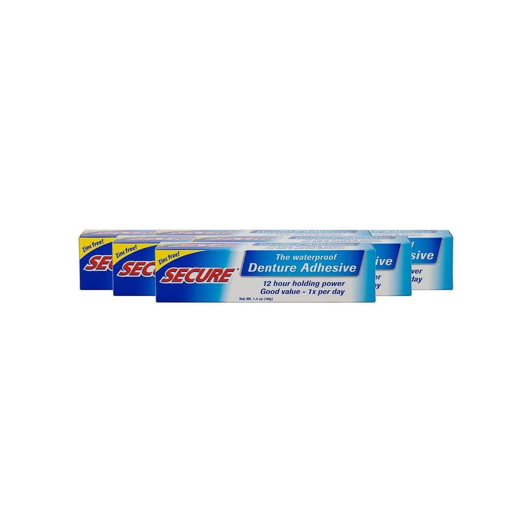 Secure Waterproof Denture Adhesive – Zinc Free – Extra Strong Hold for Upper, Lower or Partials – 1.4 oz (Pack of 6)
