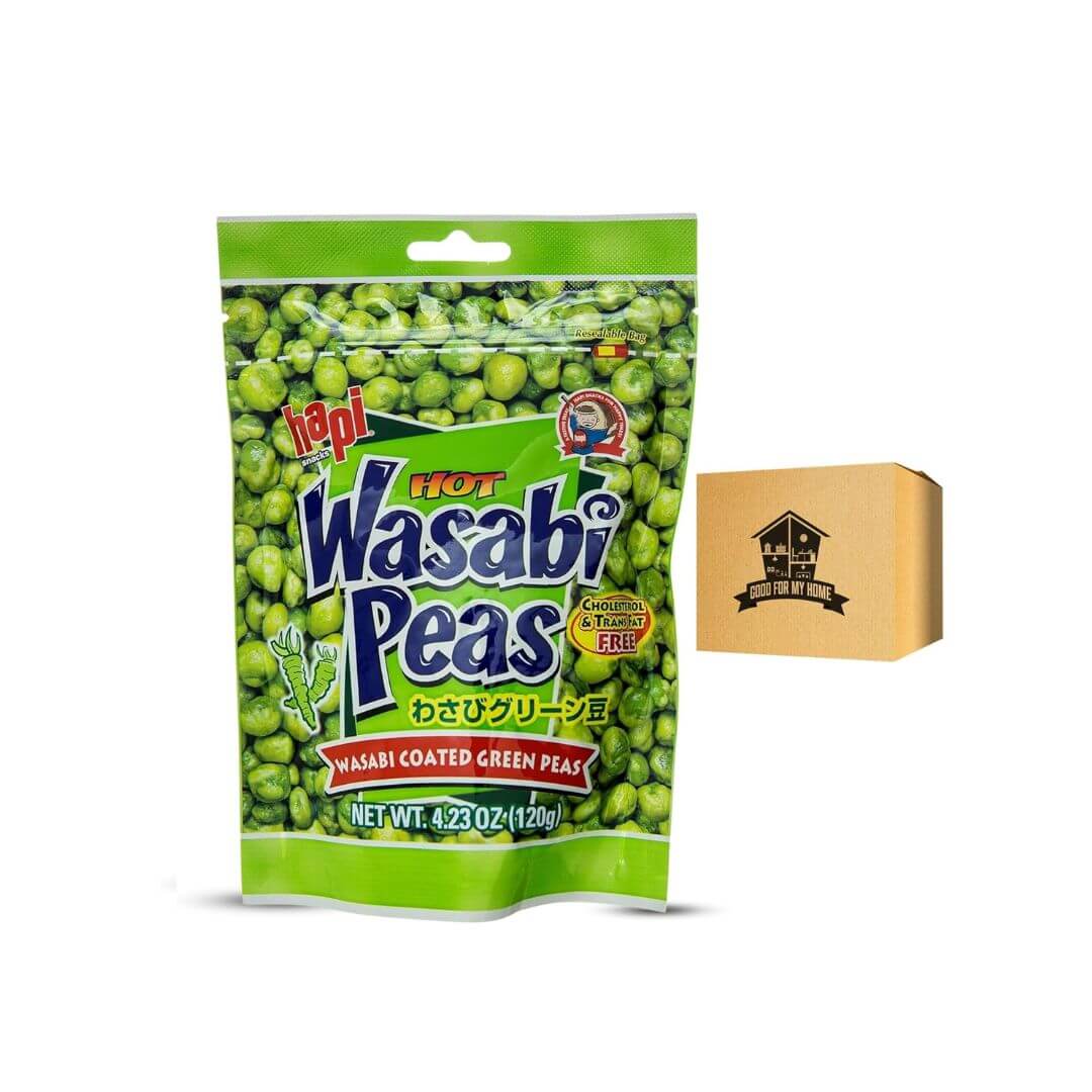 Wasabi Peas Bundle. Include 4.3 Oz Hapie Hot Green Peas Plus Good For My Home Box. Hot & Crunchy Roasted Green Peas, Delicious Hapie Snacks. Spicy Wasabi Flavor. Tasty Dried Peas Snacks