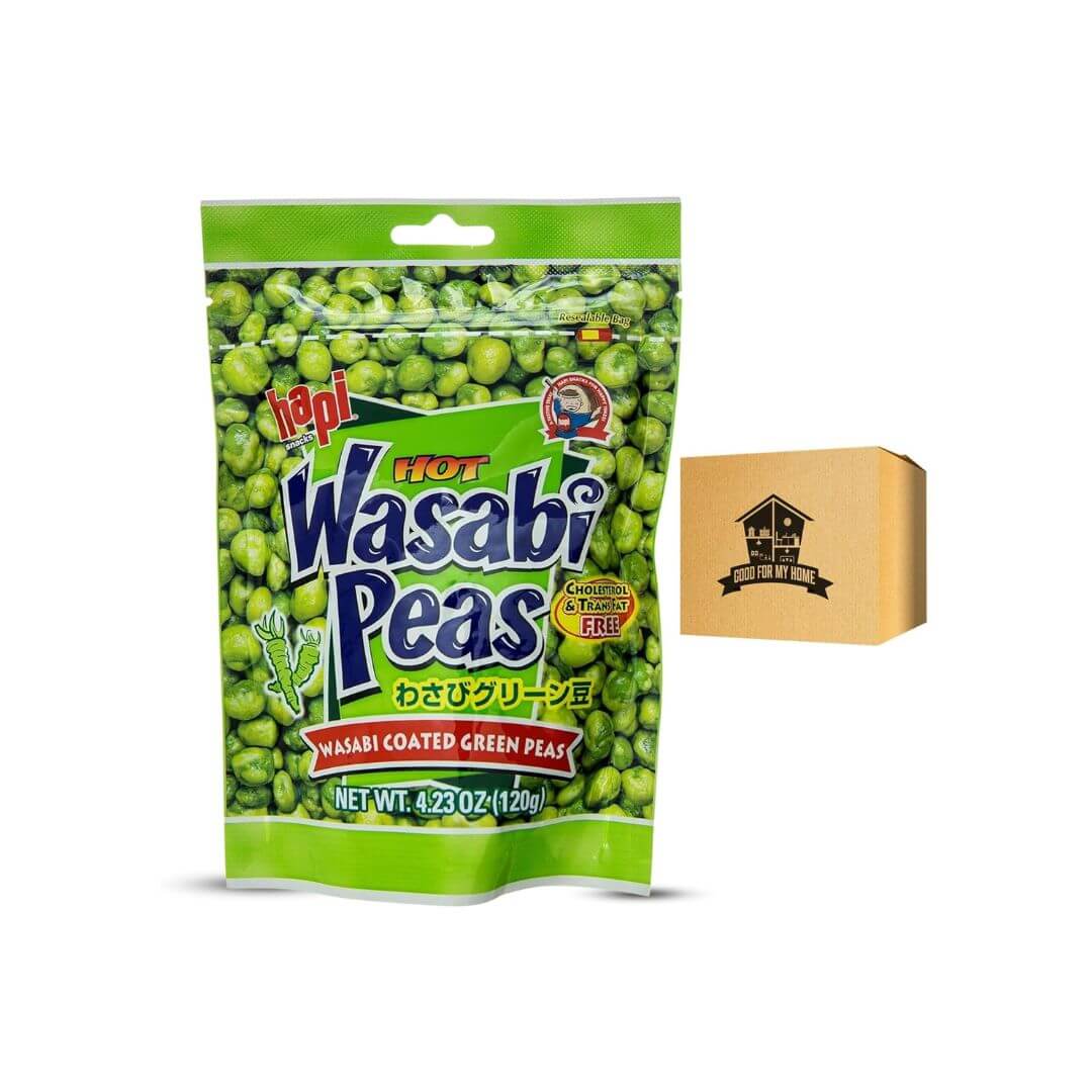 Wasabi Peas Bundle. Include 4.3 Oz Hapie Hot Green Peas Plus Good For My Home Box. Hot & Crunchy Roasted Green Peas, Delicious Hapie Snacks. Spicy Wasabi Flavor. Tasty Dried Peas Snacks