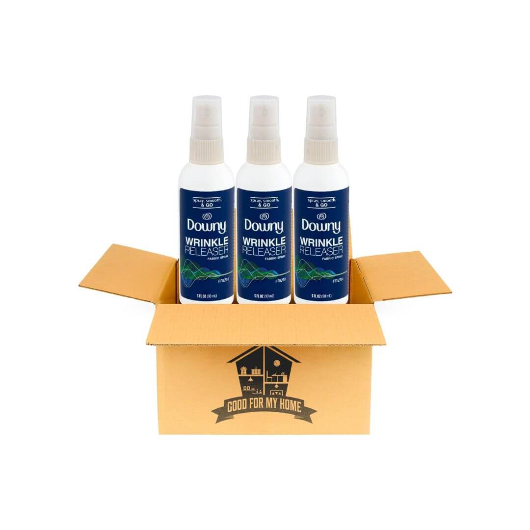 Wrinkle Release Spray Bundle. Includes Three Travel Size Downny Wrinkle Releaser Spray, 3 Fl Oz each. Travel essentials, Fabric Softener Spray, and Wrinkle Free Spray. With a Good For My Home Box!