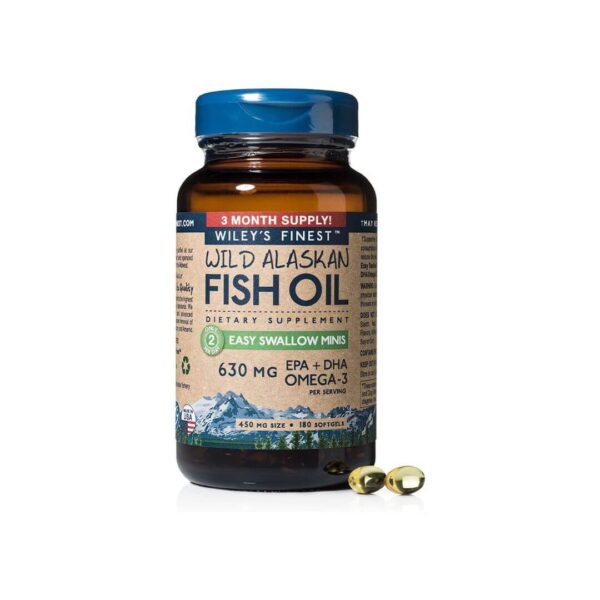 Wiley’s Finest Wild Alaskan Fish Oil Easy Swallow Minis – Omega-3 Fish Oil Supplement for Adults and Kids – Double-Strength 630mg EPA and DHA Natural Supplement – 180 Mini Softgels (90 Servings)